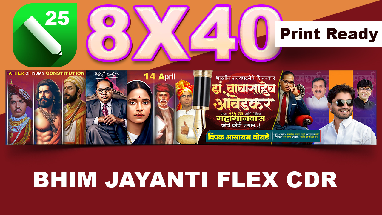 Bhim Jayanti 8×40 Flex CDR – Print Ready हा एक प्रोफेशनल फ्लेक्स बॅनर डिझाईन आहे जो खास डॉ. बाबासाहेब आंबेडकर जयंती निमित्त तयार करण्यात आला आहे. हा डिझाईन पूर्णपणे CorelDRAW (CDR File) मध्ये तयार केलेला आहे आणि Flex Printing साठी पूर्णपणे तयार आहे.