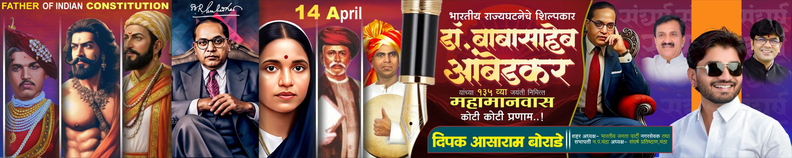 हा बॅनर डिझाईन 14 एप्रिल (आंबेडकर जयंती) साठी विशेष तयार करण्यात आला आहे. यात डॉ. बाबासाहेब आंबेडकर यांचे प्रभावी फोटो, ऐतिहासिक व्यक्तिमत्त्वांची मांडणी, आणि आकर्षक कलर कॉम्बिनेशन दिले आहे.