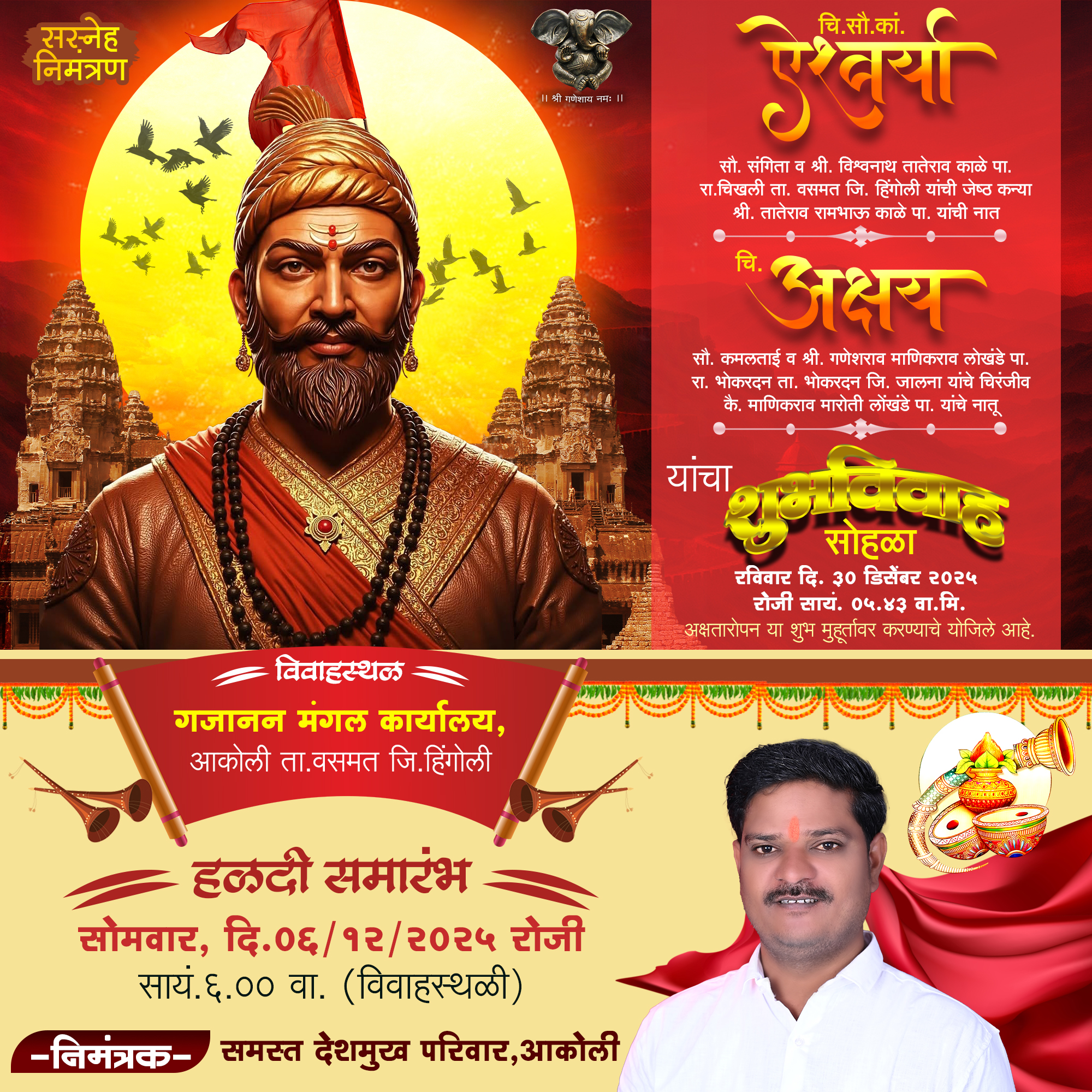 ही Shubh Vivah Marathi Wedding Invitation Card Design खास करून मराठी संस्कृती, पारंपरिक रंगसंगती आणि आधुनिक डिझाईन यांचा सुंदर संगम ठेवून तयार करण्यात आली आहे.